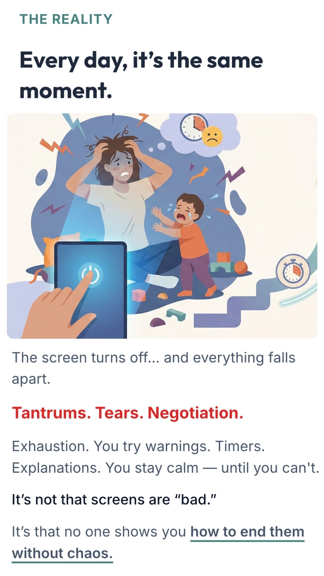 A simple, realistic system designed to help screen time end calmly. Inside, you'll find: